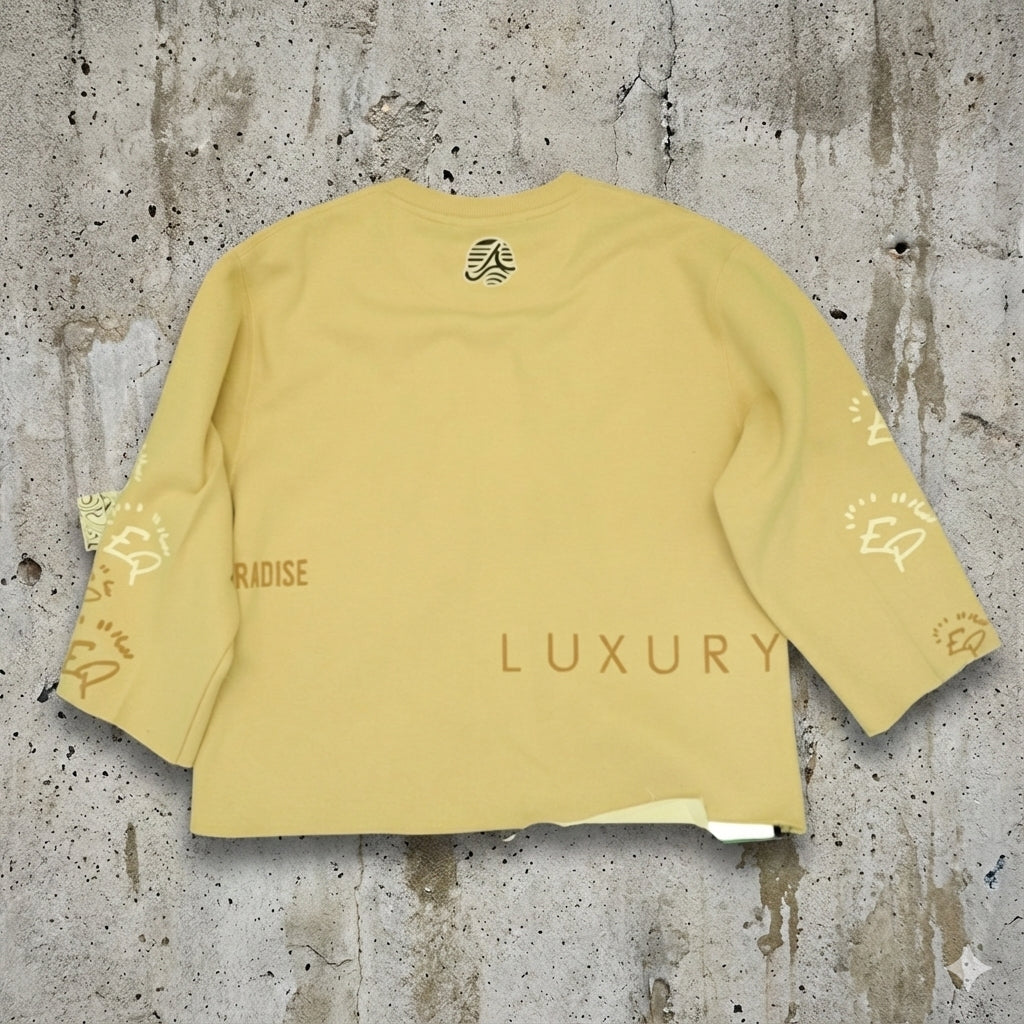 This piece features a distinct chopped mid-sleeve cut, offering a breezy, raw-hem aesthetic perfect for layering or wearing solo. Finished with a custom "Expensive Paradise" woven label on the front hem, marking it as a Limited Edition 1 of 8 piece. The open hem and relaxed fit drape perfectly over wide-leg denim or tailored shorts.